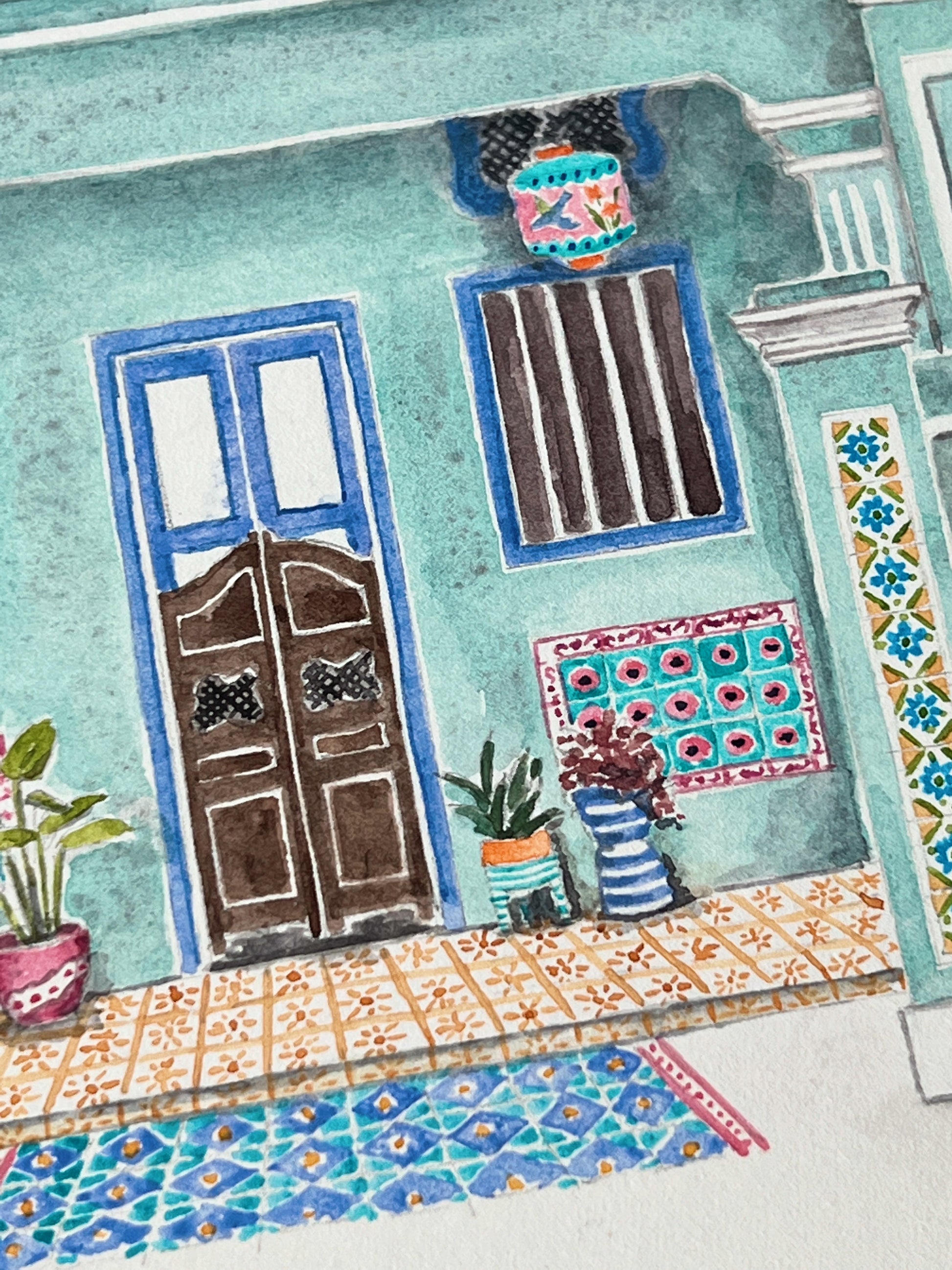 This piece is completed in June 2023. It is inspired by Singapore Peranakan shophouses in Joo Chiat. Vivid, pastel hues blend together for a beautiful mermaid colour palette, perfect for adding a little heritage and playfulness to any home.